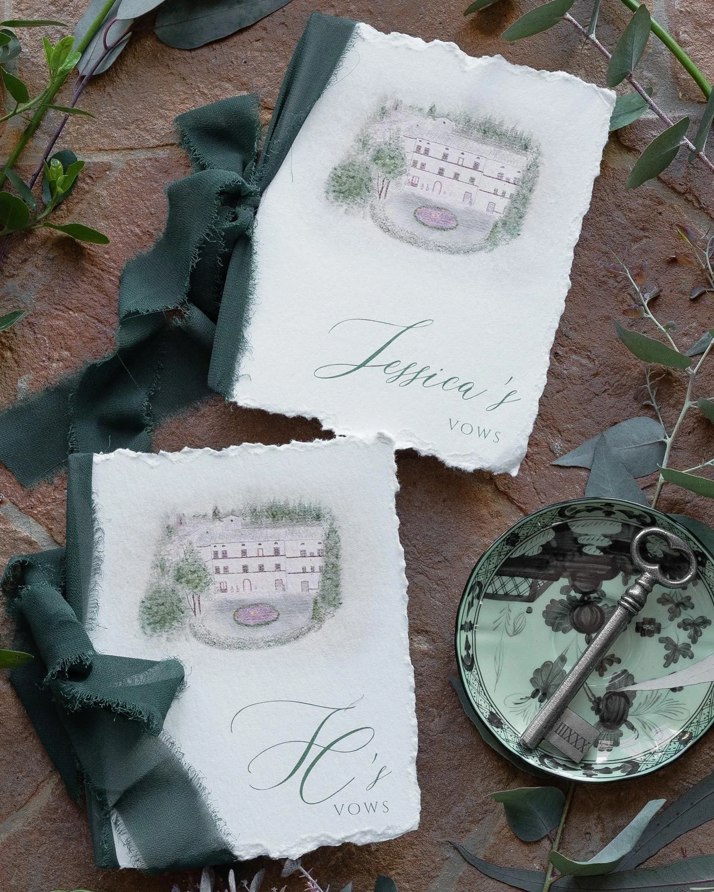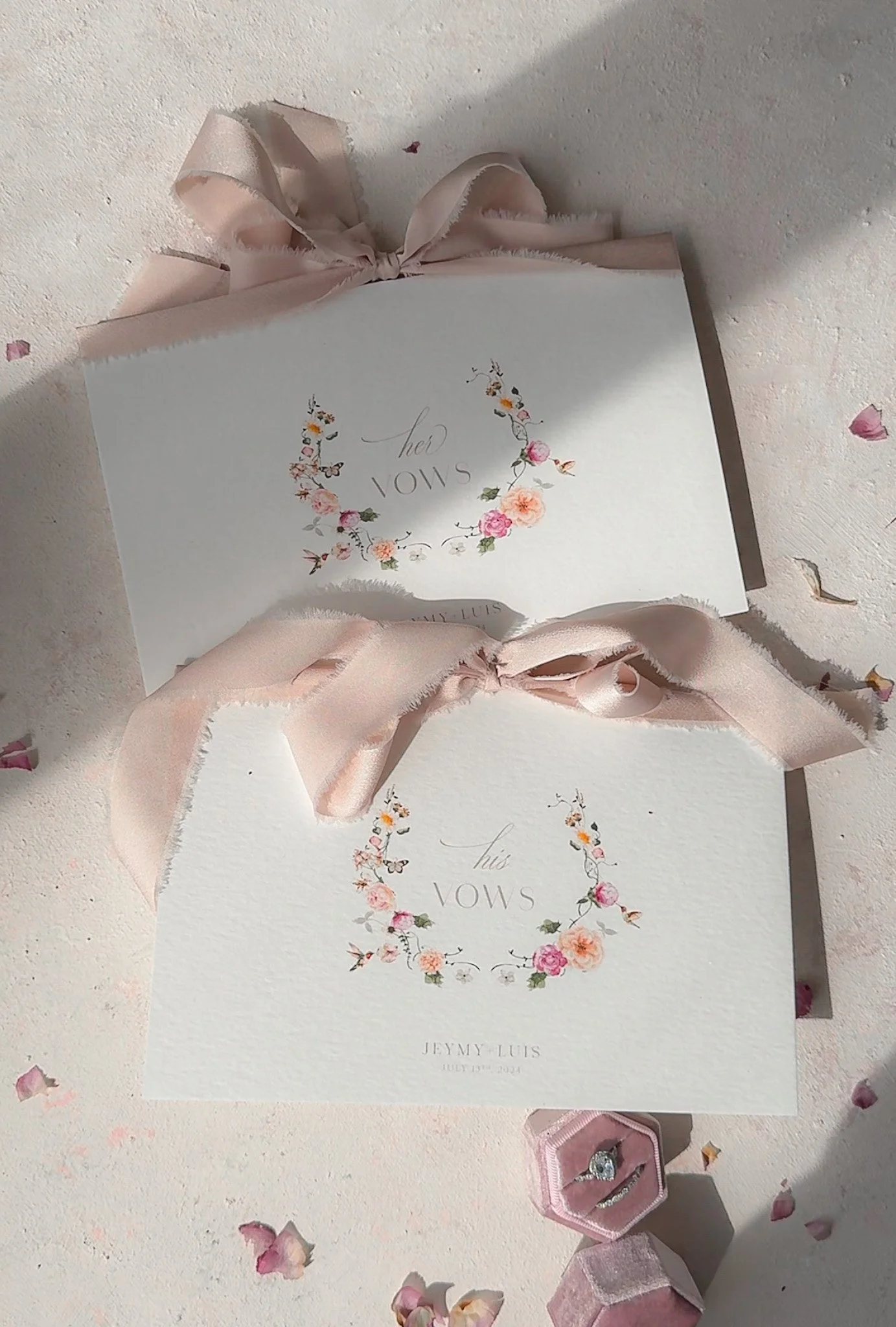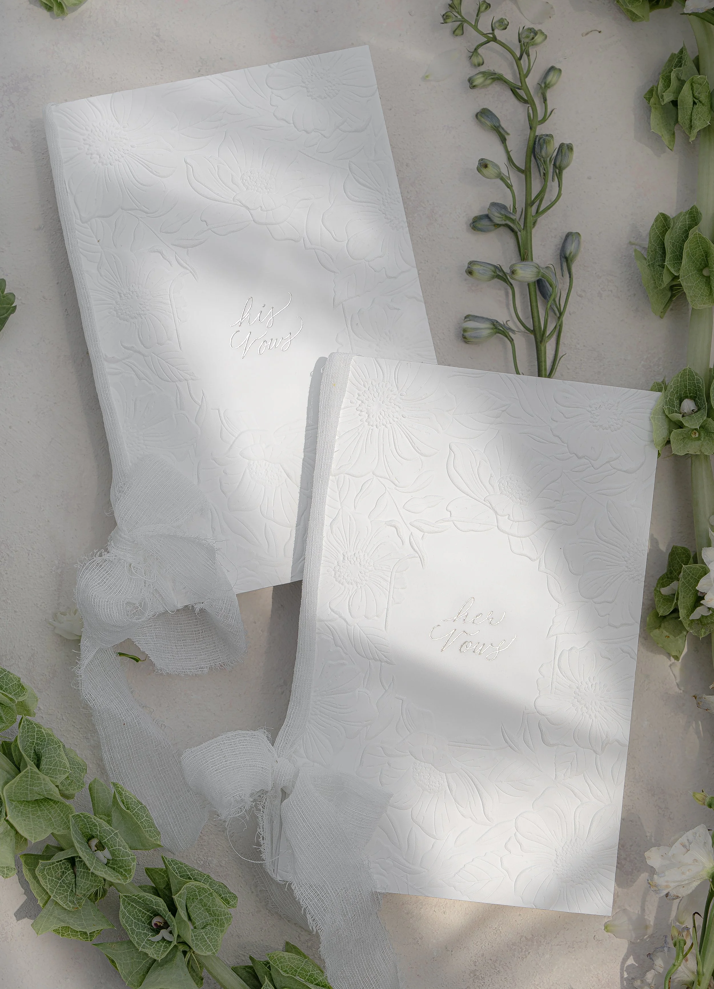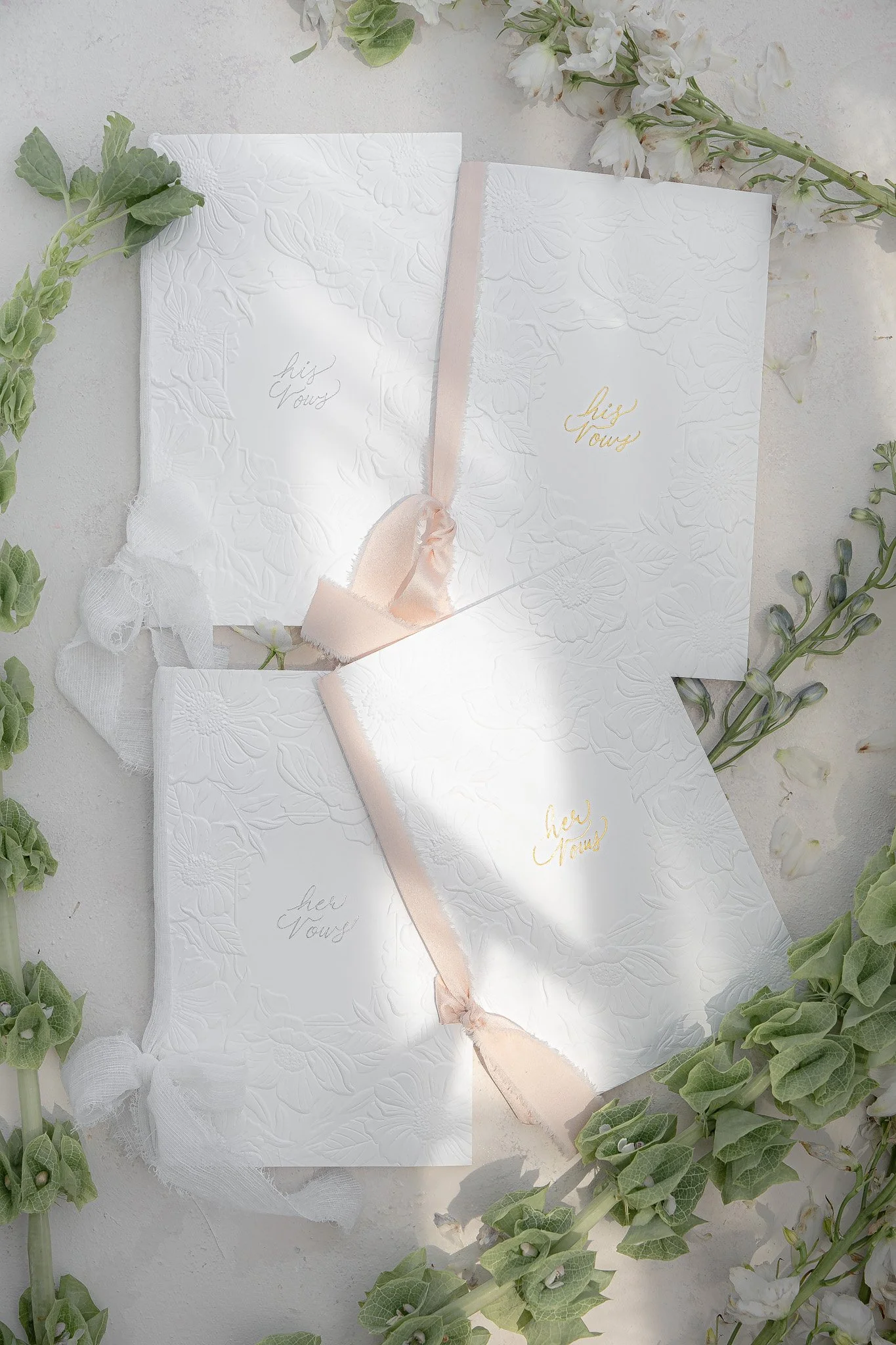 Your vows deserve a place as beautiful and meaningful as the promises themselves. Our Customizable Vow Booklet Collection is a tender way to preserve them, with options to tailor every detail to your unique theme, color palette, and story. And if the designs in our portfolio don’t quite match your vision, we’re always delighted to create a bespoke design that reflects your aesthetic in every detail.